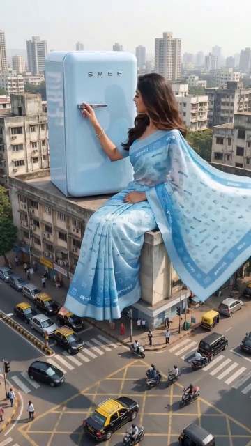 Animate the uploaded image with a still camera. The giant woman stays mostly still, keeping a soft smile, and subtly interacts with the product beside her—gently touching, holding, or gesturing towards it to highlight its details. Her saree moves gently in the breeze. Cars and people below move naturally in daylight, creating a cinematic, realistic brand ad feel. At the end of the video, she turns her gaze toward the camera, maintaining eye contact.
