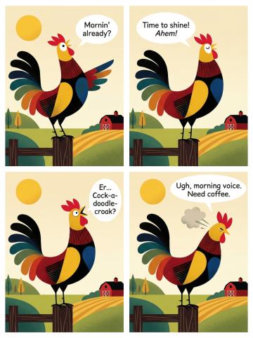 Use the character from the uploaded image exactly as it appears — keep all features, colors, proportions, and style unchanged. Create a four-panel comic/storyboard with each panel showing a different scene of the character. Maintain the same cartoon art style as the reference image. Add speech bubbles/dialogues for the character in each panel, appropriate to the story. Ensure visual continuity: same background style, color palette, and lighting consistent across all panels. Focus on clear composition, expressive poses, and readable dialogue. Output: four distinct panels forming a coherent story.