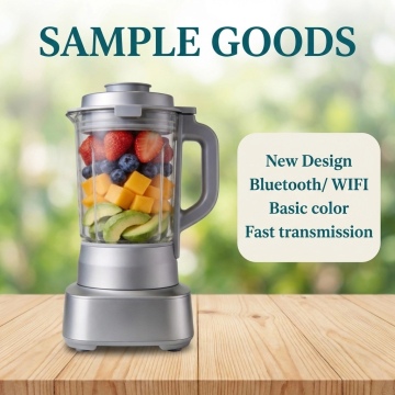 Place the product from the reference image slightly to the left of the center of the frame, standing upright on a light brown wooden table with distinct vertical wood grain patterns, which occupies the bottom portion of the canvas. The background is a soft, out-of-focus (bokeh) outdoor scene with blurred green foliage and a bright, airy atmosphere, creating a shallow depth of field that keeps the product and foreground table in sharp focus while blurring distant elements. At the top of the image, centered horizontally, display the text "SAMPLE GOODS" in a large, elegant serif font with a deep teal (dark green) color, making it prominent against the blurred background. On the right side of the frame, position a rounded rectangular text box with a pale, creamy off-white background and subtle rounded corners. Inside this box, list four lines of text in the same deep teal serif font as the top title, left-aligned: "New Design", "Bluetooth/ WIFI", "Basic color", and "Fast transmission". The overall composition is clean and modern, with the product as the central focal point, supported by the grounded wooden table and complemented by the clear, informative text elements.