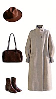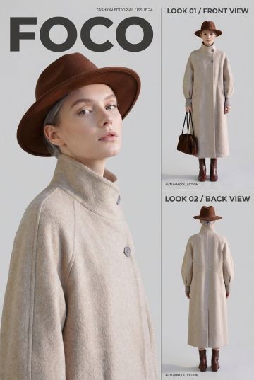 Use the uploaded image as the core content for a vertical fashion editorial spread with a clean, minimalist layout: the left side features a large chest-up close-up of a female model, while the right side displays two smaller full-body shots of the same model stacked vertically—the top shot presents the front view of the outfit, and the bottom shot shows the back view of the outfit, with the back design of the clothing imagined and realistically showcased—set against a plain light gray background. The model has fair skin and light ash-blonde hair styled in a sleek pulled-back updo. She has a calm, poised expression, posed with her body slightly angled, head tilted upward, and gaze directed at the camera. Her outfit is presented exactly as in the uploaded image, with no additional clothing details. At the top left, the word “FOCO” appears in a large, bold dark gray sans-serif font, with smaller dark gray sans-serif text to its right. On the right, the two full-body shots are labeled “LOOK 01” (top, front view) and “LOOK 02” (bottom, back view) in dark gray sans-serif, with smaller text below each. All text uses a consistent dark gray sans-serif typeface, creating a cohesive minimalist aesthetic. The balanced composition draws attention to the model and reinforces the fashion-focused narrative.