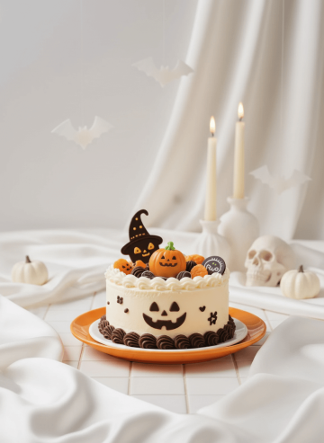 Use the product from the uploaded image, keeping its original shape, logo, and proportions completely unchanged. Transform it into a luxurious, cinematic product photo in a pure white theme, where everything feels clean, refined, and elegant. The background and tabletop are primarily white or off-white, styled with premium materials such as white silk fabric, satin drapes, matte ceramics, frosted glass, or translucent acrylic to create depth and soft texture. Incorporate subtle, elegant Halloween elements — such as white pumpkins, ivory candles, pale skulls, or delicate translucent bats — all designed in light tones so they harmonize naturally with the overall white composition. Add a focused product spotlight with cinematic lighting to enhance the product’s shape, reflections, and surface texture. Keep the composition minimal, balanced, and artistic, with soft shadows and a sense of spacious luxury. Everything should look like a high-end brand advertisement, sophisticated and visually striking without clutter.
