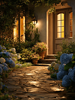 Keep the original house entrance, door, porch, and yard layout unchanged. Transform the scene into a dark, cinematic Halloween night with complete darkness outside the windows and no daylight. The outdoor area, porch, and yard are dimly lit, illuminated only by glowing pumpkin lanterns, flickering candles, warm string lights, and magical glows. Add exaggerated Halloween decorations naturally integrated: extra-large traditional white cloth ghost props with three black holes for eyes and mouth, placed on the lawn and leaning against stairs railing; a giant witch’s cauldron prominently placed, emitting thick, swirling smoke; oversized carved pumpkins on steps and yard; small skeletons scattered around; a witch doll on a chair or step; door curtains, window drapes, and other soft furnishings replaced with Halloween-themed designs (pumpkins, bats, spider motifs, orange/black/purple colors); scattered autumn leaves and cobwebs. If the door or windows have glass, subtly show the warm glow of indoor Halloween decorations such as pumpkin lanterns and string lights, visible through the glass without revealing full details, adding depth and immersive atmosphere. The overall atmosphere should feel spooky, cinematic, mysterious, immersive, and high-end, with layered shadows, soft orange glows, dramatic lighting, and enhanced Halloween horror vibe.