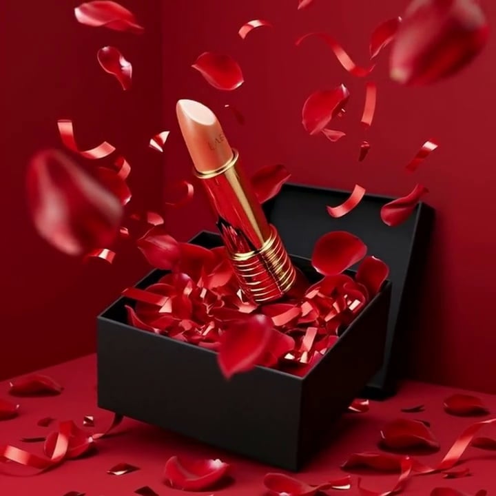 Duration: 12s | Aspect Ratio: 9:16 | Soundtrack: Soft romantic Valentine's Day instrumental (tempo elevates gently with scene progression) Shot 1 (0–1s)Cut to a high-saturation deep red matte backdrop. A lipstick (matching reference imagery) anchors the frame’s absolute center, with soft, naturally diffused lighting wrapping its form. Shot 2 (2–4s)The lipstick executes a seamless 360° rotation—camera stays fixed as the product spins smoothly, showcasing every angle of its casing. Shot 3 (4–6s · Close-Up)Transition to a tight close-up of the tube: the lipstick bullet extends ultra-smoothly at a slow pace (rising ~1/4 of its total length). The frame locks onto the bullet’s texture, highlighting its fine, even finish. Shot 4 (6–12s)Camera pulls back to frame the full lipstick (tube + extended bullet). Fine golden glitter particles bloom slowly at the frame’s core; over 1 second, they trace a fluid path to form a glowing heart outline (with a gradient CG halo along its edges). The luminous heart holds steady for the remainder of the clip.