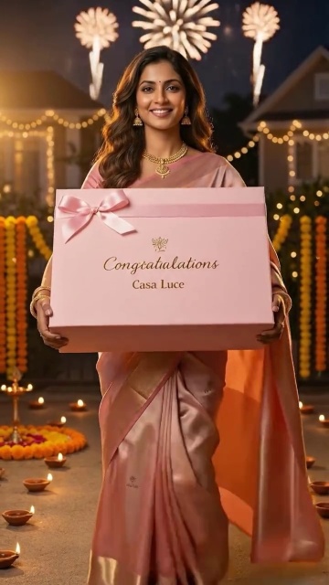 Animate this scene smoothly and realistically. The camera remains completely locked and steady. The person maintains eye contact with the camera and lifts the product box forward towards the camera to present it clearly, with natural, lifelike hand movements and a warm, festive smile. Background diyas and decorative lights softly flicker, while fireworks shimmer subtly in the sky, creating a cinematic Diwali atmosphere. The face and expression should remain 100% consistent throughout.