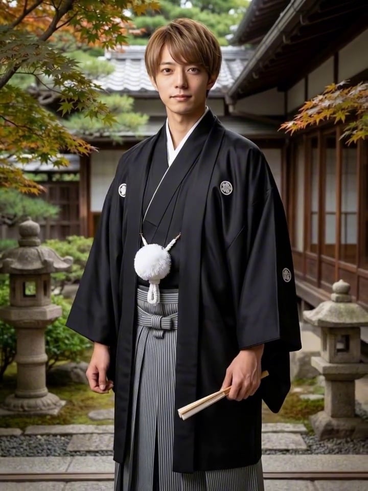 The camera pulls back from a close-up to a full-body shot. The protagonist completes the process of wearing the kimono with natural and smooth movements: First, they stretch their arms and perform a 180-degree fluid turn (with their back facing the camera momentarily), during which they simultaneously change the kimono. Then, they gracefully turn back to the front. The entire sequence of movements is smooth and continuous, presenting a natural and flowing dynamic beauty.