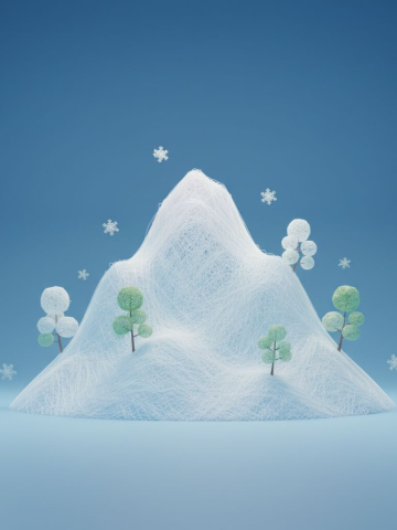 Minimalist 3D model of a simple geometric snow mountain, created with semi-transparent silk-thread material, dense fine line-weaving texture, soft fabric-like micro details, and clean gradient pastel colors. The mountain shape is smooth and simplified, with a few stylized silk-thread trees placed on the slope, all built from tightly interwoven translucent threads. Light snowflakes float around the scene as delicate thread-based particles. The background is a pure blue minimal gradient with large negative space, soft diffused lighting, dreamy surreal atmosphere, clean minimal composition, soft fresh color palette, ultra-simple structure, no clutter.