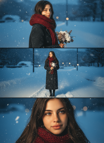 {"scene_description":"A wide-angle cinematic shot of a young couple dancing in a heavy snowstorm at night. The woman is positioned on the left of the frame, the man on the right, on a thick, textured blanket of white snow.","subjects":{"woman":{"action":"Twirling gracefully, holding the hem of her dress with one hand and the man's hand with the other.","attire":"Elegant off-the-shoulder white wedding gown with a full, flowing silk skirt and long sheer sleeves.","appearance":"Use uploaded female character, lock face + hair color, do not lock hairstyle/makeup/expression, smiling joyfully."},"man":{"action":"Leading the dance, holding the woman's hand while stepping forward slightly.","attire":"Tailored classic black suit with a white dress shirt.","appearance":"Use uploaded male character, lock face + hair color, do not lock hairstyle/makeup/expression."}},"environment":{"ground":"Deep, powdery snow with visible footprints and soft undulations.","atmosphere":"A heavy blizzard with thick, elongated white snowflakes falling diagonally across the frame.","background":"A dark, void-like night sky that creates a sharp contrast with the brightly lit foreground."},"lighting_and_color":{"lighting_style":"High-key spotlighting from above, creating a glow on the subjects and the snow while leaving the background in deep shadow.","color_palette":"Monochromatic contrast of stark whites, deep blacks, and neutral grays.","mood":"Romantic, ethereal, and dramatic."},"technical_specs":{"aspect_ratio":"2:3 (vertical)","camera_angle":"Eye-level, medium-wide shot.","focal_details":"Soft focus on the falling snow to create a sense of motion blur, while the subjects remain the primary focal point."}}