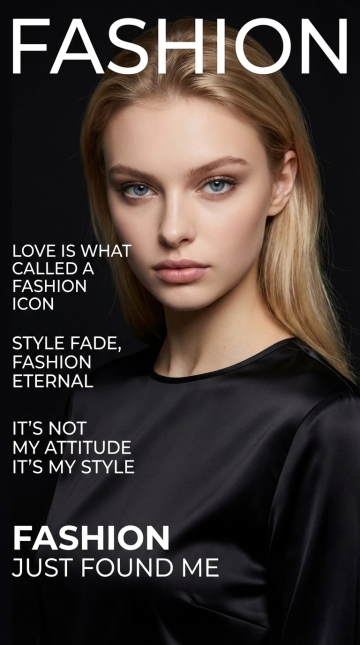 Use the uploaded portrait as the central subject in a vertical 9:16 aspect ratio canvas, designed as a high-end fashion magazine cover: the subject is captured in a tight chest-up close-up, with her head slightly tilted forward, facing the camera directly with a sharp, fierce, and penetrating gaze, her lips closed firmly in a calm, confident, and cool expression that combines sharpness and subtle sweetness, featuring polished, refined makeup with prominent eye makeup and clean, elegant lip makeup, and wearing a sleek, glossy black satin top that drapes smoothly over her shoulders, exuding elegance and sophistication, set against a deep, matte black background that is clean and uncluttered to keep the focus firmly on the subject. Layer the text elements in a modern editorial layout: at the top left, the word "FASHION" is displayed in a large, neat, minimalist white geometric sans-serif font; on the left side, three lines of small, clean white geometric sans-serif text are stacked vertically in a stepped, cascading layout where each subsequent line is slightly longer and extends further to the right, reading "LOVE IS WHAT CALLED A FASHION ICON", "STYLE FADE, FASHION ETERNAL", and "IT'S NOT MY ATTITUDE IT'S MY STYLE"; at the bottom left, two lines of white geometric sans-serif text appear, with "FASHION" in bold style above "JUST FOUND ME" in regular weight, all text is crisp white, creating a stark, high-contrast against the dark background, and arranged to frame the central subject, ensuring she remains the clear focal point while maintaining a polished, modern fashion magazine cover aesthetic.