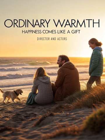 A family movie poster called "ORDINARY WARMTH" with the subtitle "HAPPINESS COMES LIKE A GIFT DIRECTOR AND ACFORS" depicts a couple sitting on the beach with their children, and a puppy playing next to them, creating a warm and cozy atmosphere.