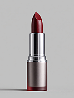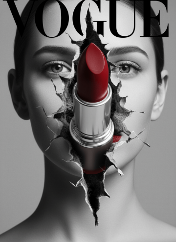 A full-frame VOGUE magazine cover filling the entire image, presented edge-to-edge. The cover is in high-fashion black-and-white with a refined female portrait; only her lips remain vividly red and glossy. The top displays the bold title “VOGUE.” At the center of the magazine, a vertical tear splits the cover open. The tear’s edges are extremely rough, jagged, and uneven, with thick fibers, torn layers, and irregular contours — the look of paper violently hand-ripped, not cleanly cut. The opening tightly hugs the shape of the lipstick, but remains chaotic and organically torn. From this vertical tear, an oversized, dramatically large version of the reference lipstick bursts outward. The lipstick does not obey realistic scale — it is intentionally huge, dominating the frame. Give the lipstick strong perspective, with the tip angled forward like a bullet head shooting at a slight upward angle toward the viewer. Half of the lipstick remains inside the dark, deep shadowed tear; the other half explodes outward, creating powerful momentum and visual impact. Emphasize the contrast between the elegant fashion cover and the brutally torn rupture with a massive, forward-thrusting lipstick breaking through it.