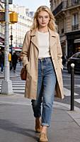 Start from the first uploaded image. The floating collage-style fashion items visible in the first image remain suspended briefly. Then, the floating garments begin to move toward the model one at a time, in a clear and sequential order. The first floating garment rapidly flies toward the model. At the moment of impact, reality subtly distorts — the surrounding air and background stretch inward for a brief instant, as if space itself is being pulled toward the garment. Simultaneously, a playful cartoon-style overlay briefly appears around the impact area: hand-drawn outlines, flat graphic shapes, and sticker-like motion accents wrap around the garment for a split second. As the cartoon layer snaps away, a short burst of expressive energy radiates outward, visualizing the model’s joy — light motion lines and rhythmic pulses that echo her excitement. The original basic clothing in that area disappears instantly and cleanly. The floating garment seamlessly replaces it, fully integrating into the model’s outfit. Only after this transformation is fully completed does the second floating garment accelerate toward the model. Each garment repeats the same sequence: impact, subtle spatial distortion, brief cartoon overlay, emotional energy pulse, clean replacement. Each transformation happens one by one, never simultaneously. No additional floating garments appear, and the total number of transformations exactly matches the number of floating garments shown in the first uploaded image. After the final garment merges into the model, no clothing remains floating in the air. The model is now fully dressed in the complete outfit formed from the previously floating collage garments. The entire transformation unfolds as a continuous, magical yet realistic physical process, with no cuts, no jumps, no edits, and no camera breaks. The scene then smoothly transitions into the second uploaded image. During the transition, the model poses confidently toward the camera, happily presenting the outfit she is wearing, with joyful expression and natural, lively movement. The full sequence appears as one uninterrupted shot — ultra-smooth, seamless, and believable, like a real-world transformation infused with imagination.
