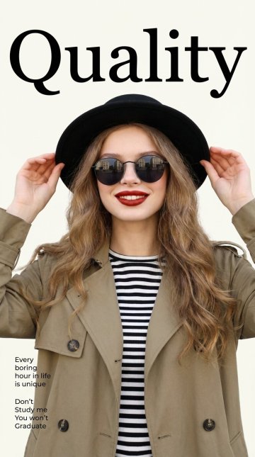 The image is very bright with an off-white background. The figure is at the visual center. She has exquisite makeup with rich retro red lipstick, wearing a black dome hat and black round metal-frame sunglasses whose lenses reflect urban buildings. She is dressed in a khaki trench coat with a black-and-white striped crew neck top underneath. She holds the hat gently with both hands, looking confident and dynamic. At the top of the image is the huge black serif font "Quality". On the lower-left side, small black sans-serif English texts are arranged vertically: "Every boring hour in life is unique" and "Don’t Study me You won’t Graduate".