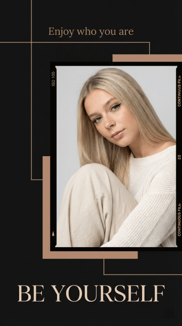 The background is solid deep black, decorated with light brown geometric lines and color blocks. The photo is a close-up shot, positioned on the right side of the frame, taking up 40% of the frame area, with a light gray background inside the photo. In the photo, the model has fresh and delicate makeup, with eye makeup emphasizing eyelashes and eyeliner, and natural nude-pink lips. Her gaze is gentle yet confident, looking directly at the camera. She wears an off-white loose knit sweater and matching light beige wide-leg pants. She sits with knees bent in a relaxed and natural posture. The photo is framed by a vintage film border marked with "ISO 100", "02" and other continuous logos. At the top of the frame is the light brown serif text "Enjoy who you are". At the bottom is the large, elegant light brown serif font "BE YOURSELF".