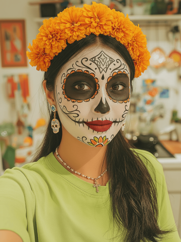 masterpiece, best quality, ultra-detailed, original girl, clothing, background, lighting, pose unchanged, only apply Día-de-los-Muertos makeover: - face paint — porcelain-white base with intricate black sugar-skull filigree around eyes, hollow-eye sockets, spider-web temples, vibrant marigold-orange accents on cheeks and nose tip, - rich crimson lips outlined in black, tiny marigold petals drawn along cupid’s bow, - jewelry: traditional marigold-flower crown (cempasúchil) on head, delicate beaded necklace with small sugar-skull pendant and golden cross, matching drop earrings,