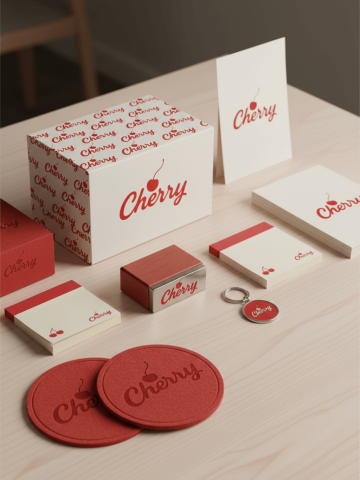 Referring to this pattern LOGO, the brand name is "Cherry", and print this LOGO on fire stamps, sticky notes, paper bricks, coasters, keychains, and paper cards. The main visual color is cherry red, presenting a modern, exquisite and intimate style. Finally, display all the products together.