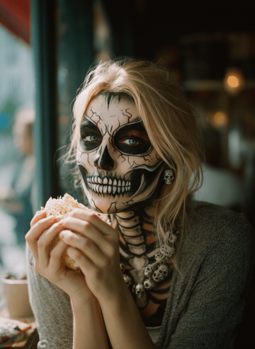 Transform the character's face into a terrifying, artistic, and gothic Halloween skull makeup without whitening the skin. Keep the original character, outfit, pose, and background completely unchanged. Apply realistic black and dark gray shadows to create sharp skull bone contours on the cheekbones, temples, jawline, and forehead, emphasizing depth and three-dimensionality. extend the skull design onto the neck, depicting realistic cervical vertebrae and collarbone bones for a continuous skeletal effect. Shape the eye sockets into sharp, angular, artistic mask-like designs with deep hollow effects, fine cracks, and subtle dark red veins for a menacing gothic look. Draw sharp, precise skull teeth over the lips using shadow and line work rather than white paint. Add artistic cracks and fractures on the forehead, cheeks, and chin. Include subtle skull-themed earrings, bone necklaces, or gothic skull decorations if suitable. Style should be ultra-realistic, highly detailed, three-dimensional, cinematic, spooky yet artistic, 8k quality, professional makeup, gothic horror aesthetic, keeping natural skin tones.