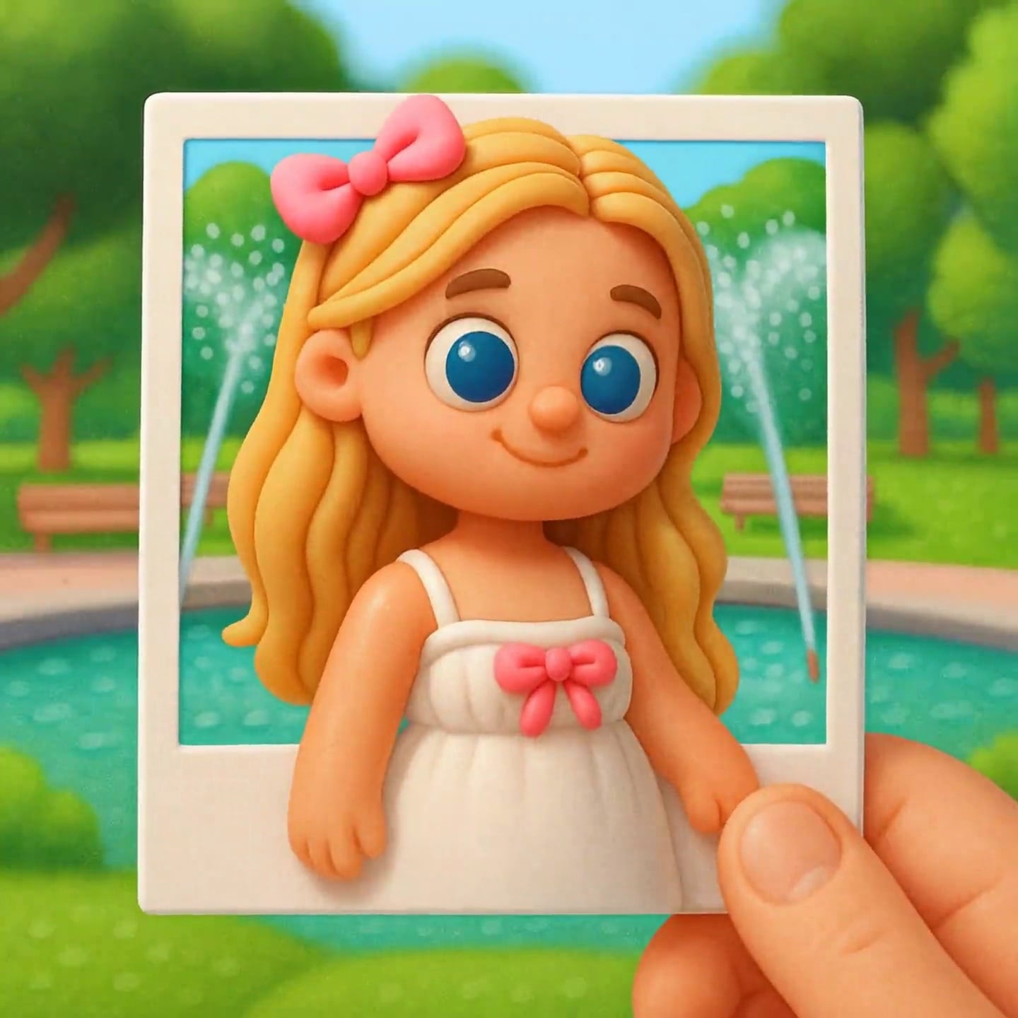 The camera moves forward, gradually transitioning from one photo to another. The photos slowly transform into cartoon images, with dynamic blurring and delayed photography, creating a smooth transition.