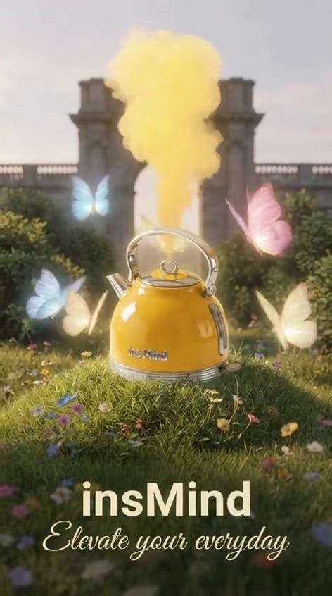 In the picture, the butterfly is slowly and powerfully flapping its wings and flying around the center of the teapot (in slow motion). The teapot is emitting yellow steam, maintaining the consistency of the main subject. The text in the foreground remains still. 8K resolution, smooth picture quality, the camera slowly pulls away.