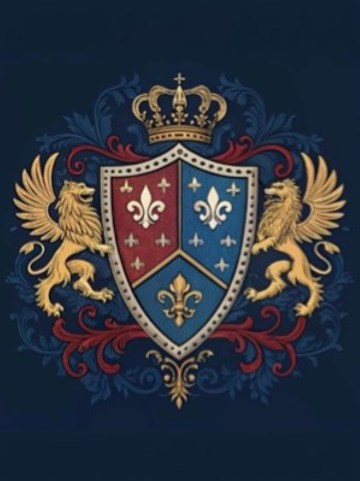 Symmetrical heraldic shield, with a delicate shield in the center, surrounded by fierce and majestic animal and plant patterns, a crown with gems, exquisite Baroque style, complex hollowing craftsmanship, Renaissance manuscript style, strong contrast between light and dark, 8k delicate relief texture, precise vexillology style, solemn sense of ceremony, complex carving details, high-quality relief design, strong contrast between light and dark, the overall retro traditional blue/gold/red, traditional European heraldic design