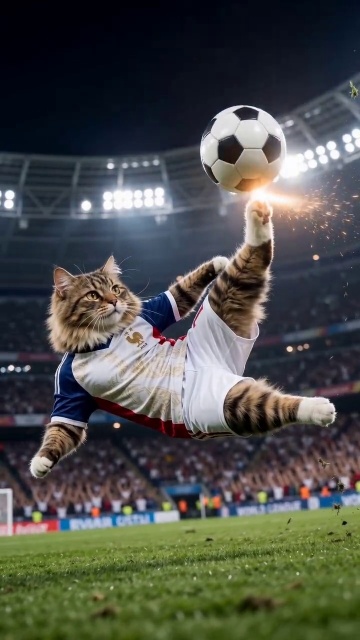 1:1 Reconstructed the animal as shown in the reference picture. It is performing an aerial football action - riding a bicycle and kicking the ball. Wearing a white World Cup jersey, with a pure white base color, deep blue on the shoulders, and red decorations on the sides; featuring a jacquard pattern with golden championship stars and lion patterns on the body. Vertically suspended in the air, the right hind leg is stretched high to hit the ball, imitating the overhead kicking action of professional football players.