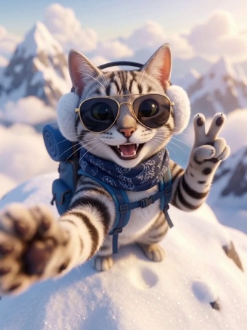 3D Disney animation style, A 3D stylized animal character (1:1 scale to reference) is taking a selfie directly facing the camera, wearing dark sunglasses with fine gold edges, white ear covers, and a blue outdoor backpack. One of its front paws extends towards the camera (slightly blurry), imitating the pose of a human taking a selfie. The background is a 3D-rendered scene of a snow-covered mountain top.