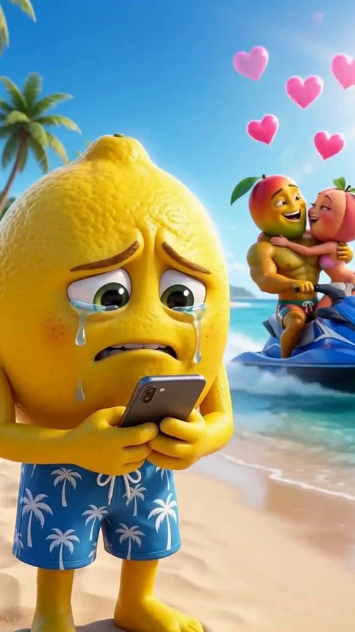 The main character A is a lemon person, the main character B is a mango person, and the main character C is a peach person. Main character A is wearing blue beach shorts with a white palm tree pattern printed on them, muscular main character B is wearing swimming trunks showing off his muscles, and main character C is wearing a bikini. Main character A: "This can't be..." Why him? He's just an ordinary mango that has been fed hormones!”