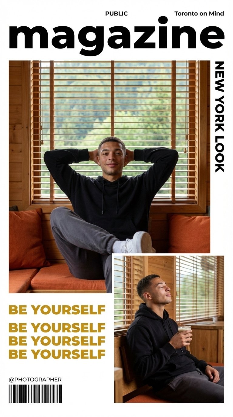 "value": "Use the uploaded portrait images as the core content in a vertical 9:16 magazine cover layout with a clean white border: the main portrait (occupying the upper two-thirds of the canvas) shows a person sitting directly in front of a single window with horizontal blinds, hands behind their head, legs crossed and raised, gaze directed at the camera with a relaxed, confident expression; the background features wooden walls, orange cushions, and through the gaps in the blinds, a lush, green forest landscape is visible, with soft natural light filtering into the room. The smaller inset portrait (positioned in the lower right quadrant) shows the same person seated sideways, holding a drink, with eyes closed and a deeply relaxed, content expression as if savoring the moment, set against a backdrop of wooden furniture and the same window blinds, with gentle natural light illuminating the scene. Layer text in a modern editorial style: at the top center, the word \"magazine\" in a large, bold black sans-serif font; the top edge features small black sans-serif text reading \"PUBLIC\" (center), and \"Toronto on Mind\" (right); vertically aligned on the right side is the text \"NEW YORK LOOK\" in a black sans-serif font; vertically aligned on the left side is the phrase \"BE YOURSELF\" repeated four times in a bold yellow (golden) sans-serif font; at the bottom left, a black barcode and the text \"@PHOTOGRAPHER\" appear in a small black sans-serif font, with all text and inset elements framing the main portrait to keep it as the clear focal point, creating a polished, contemporary magazine cover aesthetic."
