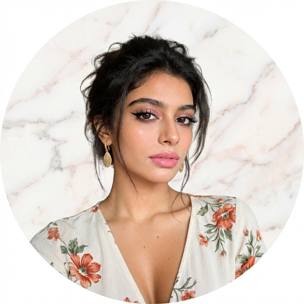 "value": "Round fresh-style portrait.\nInside the round frame, the background is light off-white marble texture with natural light gray and pale pink veins.\nThe figure is in the center of the frame, with fresh and natural makeup, eye makeup emphasizing eyelashes and eyeliner, and lips in soft nude pink.\nHer eyes are bright and clear, looking directly at the camera, giving a pure and spiritual vibe.\nShe wears an off-white floral top with a deep V-neck design, printed with orange-red and green floral patterns for a fresh touch.\nShe also wears a pair of delicate gold earrings with textured details.\nThere is a certain distance between her head and the top of the frame."
