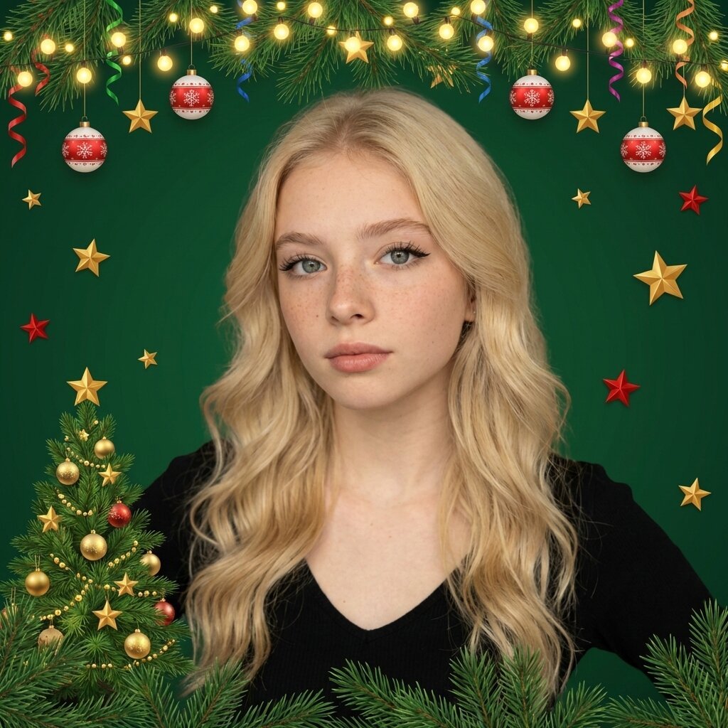 "value": "The background is a rich dark green.\nThe model has a clear and natural makeup look, with eye makeup emphasizing eyelashes and eyeliner, and natural nude-pink lips.\nHer gaze is calm and slightly distant, looking directly at the camera.\nShe is wearing a black V-neck top, positioned slightly below the center of the frame, with some distance from the top.\nAt the top of the image is a decorative strip made of pine branches and warm yellow fairy lights, hanging with red-and-white Christmas baubles, golden stars and colorful ribbons.\n the lower-left corner stands a small Christmas tree decorated with golden baubles and stars.\nGolden and red star decorations are scattered across the image, and pine branches decorate the bottom.broad shoulders"