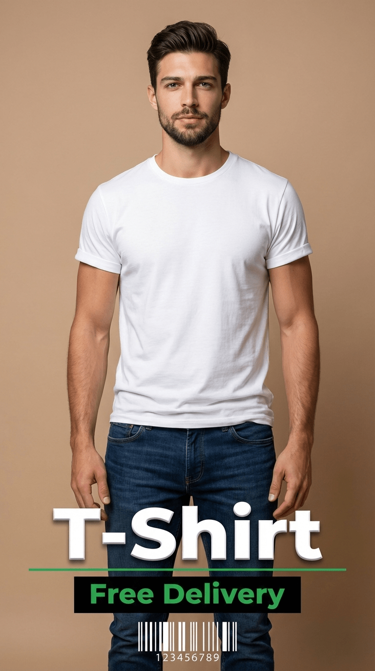 "value": "Simple commercial style. The background is plain light brown.A man is wearing a pure white crew-neck short-sleeve T-shirt with rolled-up cuffs, paired with dark blue slim-fit jeans.\nHe stands naturally in a relaxed posture, with soft and even lighting on his clothes and skin.\nAt the bottom of the image is the huge white bold 3D font \"T-Shirt\".\nBelow it is a thin green horizontal line, and under the line is the green bold sans-serif text \"Free Delivery\" on a black rectangular background.\nAt the very bottom, there is a white barcode with the number \"123456789\"."