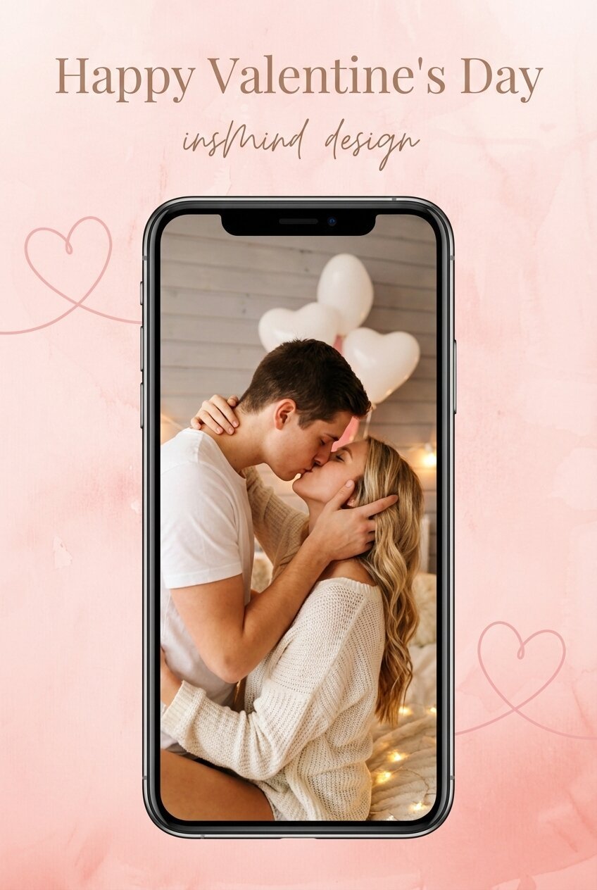 "value": "Vertical poster, extremely intimate with bold and passionate movements.\nThe image has a romantic pink screen filter with warm-toned visuals.\nThe background features a soft pink watercolor wash texture, accented with light pink heart outline lines.\n\nIn the center of the image is a mobile phone screen showing an intimate young couple.\nClose-up on their kiss, from a slightly high-angle perspective.\nThe boy wears a white short-sleeve T-shirt, with his arm around the girl, leaning down to kiss her affectionately.\nThe girl wears an off-white loose knit sweater, with one arm around the boy’s neck and the other caressing his head.\n\nThe design emphasizes the romantic gestures of embracing and kissing.\nThe background is a warm indoor setting: light gray wooden walls, white heart-shaped balloons, off-white plush fabric, and scattered warm fairy lights, rich in details, full of life and romance.\n\nAt the top of the image is the light brown serif font “Happy Valentine's Day”, with the same-color handwritten English “insMind design” below it, elegant and romantic."
