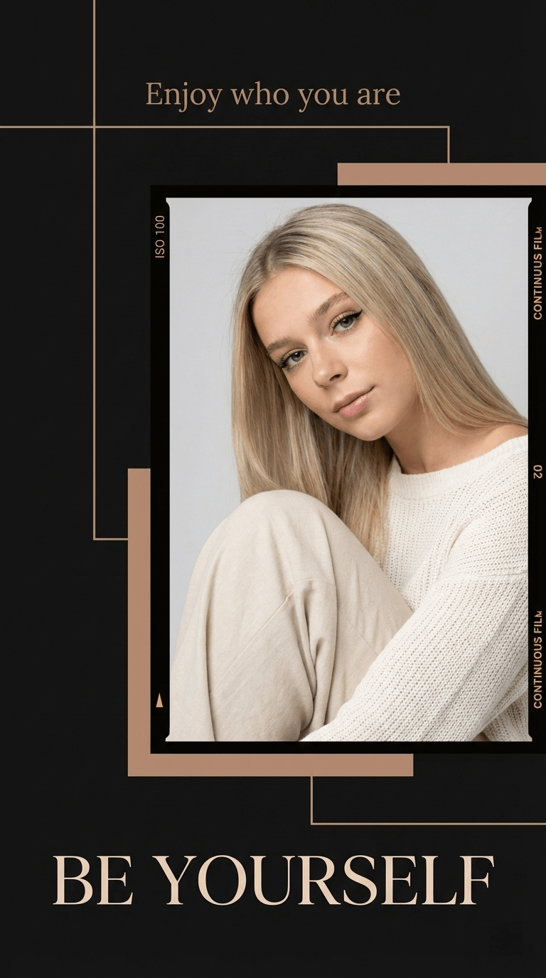 "value": "The background is solid deep black, decorated with light brown geometric lines and color blocks.\nThe photo is a close-up shot, positioned on the right side of the frame, taking up 40% of the frame area, with a light gray background inside the photo.\n\nIn the photo, the model has fresh and delicate makeup, with eye makeup emphasizing eyelashes and eyeliner, and natural nude-pink lips.\nHer gaze is gentle yet confident, looking directly at the camera.\nShe wears an off-white loose knit sweater and matching light beige wide-leg pants.\nShe sits with knees bent in a relaxed and natural posture.\n\nThe photo is framed by a vintage film border marked with \"ISO 100\", \"02\" and other continuous logos.\n\nAt the top of the frame is the light brown serif text \"Enjoy who you are\".\nAt the bottom is the large, elegant light brown serif font \"BE YOURSELF\"."