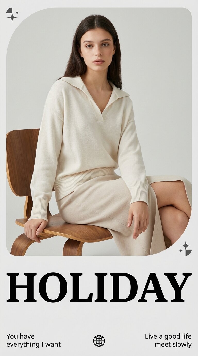 "value": "Overall in a minimalist modern style.\nThe portrait is positioned in the upper part of the frame (occupying 60% of the image), with a light gray background behind the figure. The background has rounded corners on the diagonal, and a small inverse-color graphic decorates each blank diagonal area.\nAt the bottom of the frame is the large bold black serif font “HOLIDAY”.\nBottom left: “You have everything I want”\nBottom right: “Live a good life meet slowly”\nA tiny black earth icon is placed in the middle of the bottom section.\nThe model has fresh and refined makeup with natural lip color. Her gaze is calm and slightly distant, looking directly at the camera, exuding an elegant and high-end aura.She wears an off-white loose knit top with a wide lapel design, ribbed cuffs and hem. The fabric is soft and drapey, with a relaxed, comfortable fit.\nShe pairs it with a matching light beige midi skirt with a side slit, revealing part of her leg line. The overall outfit is simple yet layered.\nShe sits sideways on a wooden curved-edge chair in a relaxed and natural posture, one hand resting lightly on the chair, the other hanging naturally.\nSoft, even light falls on her clothing and skin, highlighting the delicate texture of the materials and the overall elegant atmosphere."