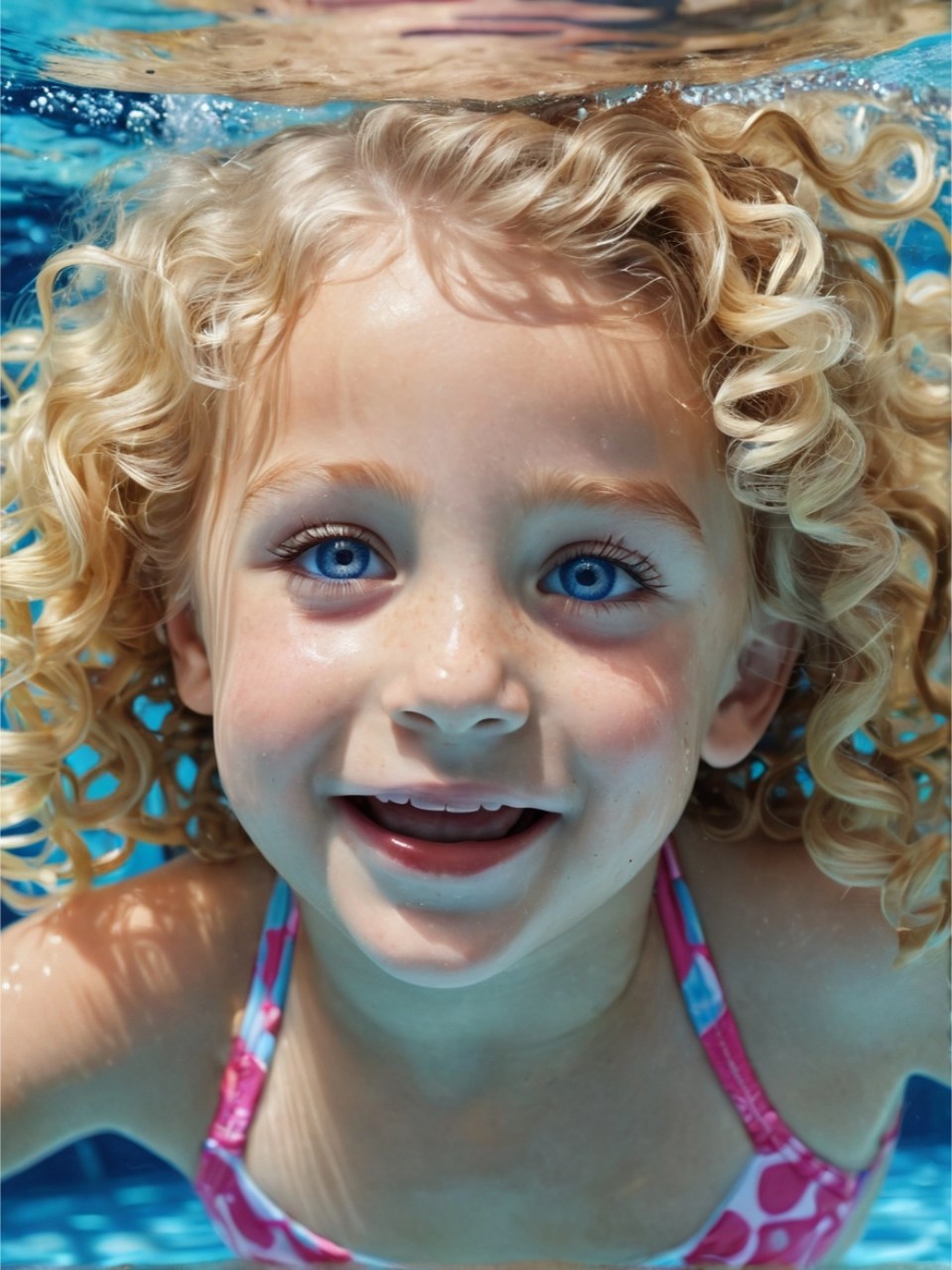 Portrait of a woman with red hair floating underwater, eyes closed, with a dreamy and ethereal atmosphere. Soft, natural light filters through the water's surface, creating a close-up shot that captures her peaceful expression. The tranquil blue background complements the scene. which provided sharp focus on the subject's face