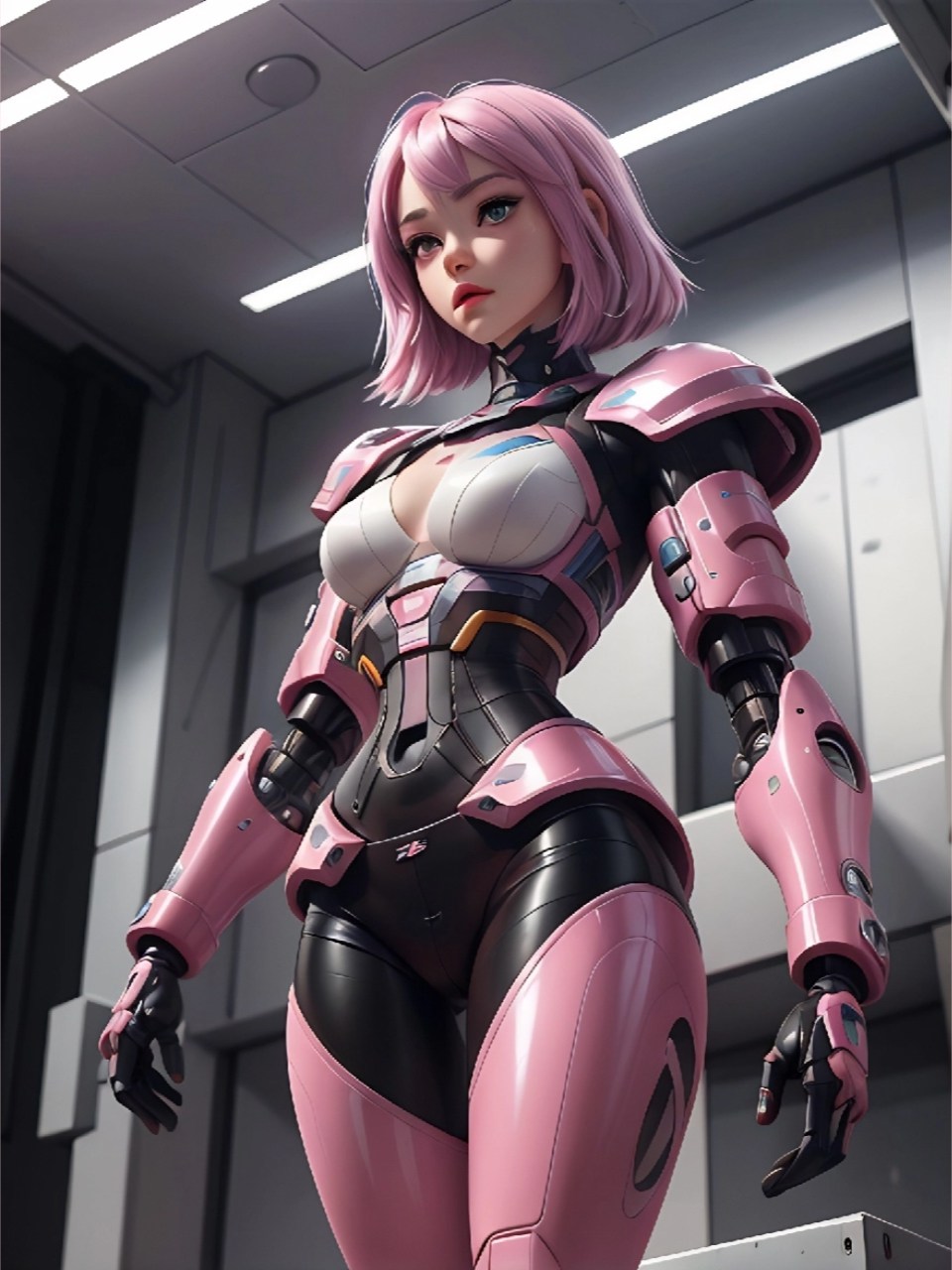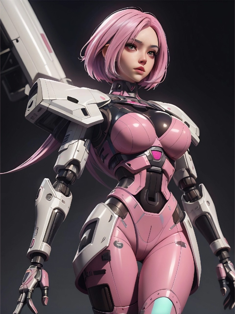 A beautiful pink-haired female robot with pastel hair, porcelain skin, and white eyesFull-body photo, heavy mecha,,The artwork is hyper-realistic, hyper-detailed, hyper-photorealistic, and hyper-futuristic, with a cyberpunk aesthetic and soft lighting