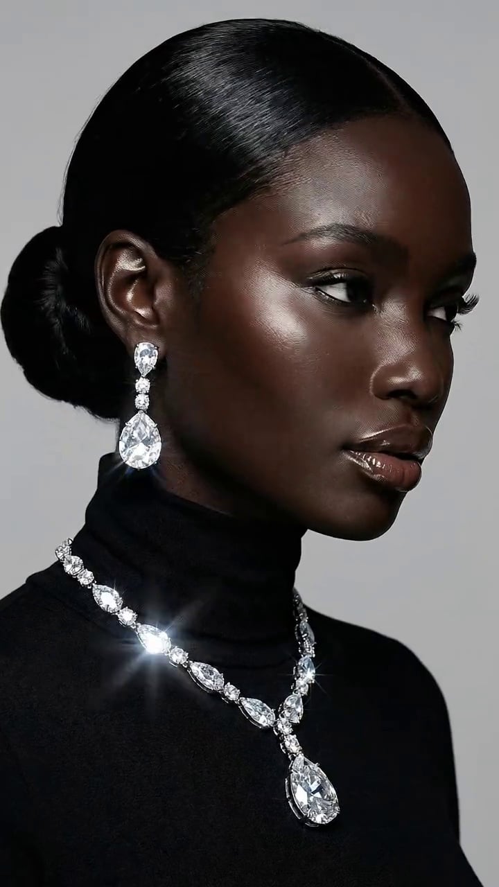 "clothing": "High-neck black turtleneck in a matte fabric to contrast with skin luminosity",