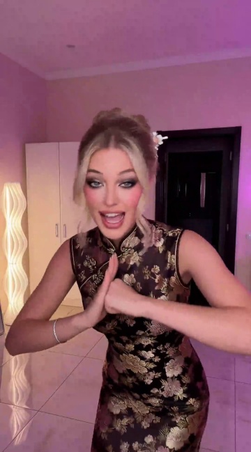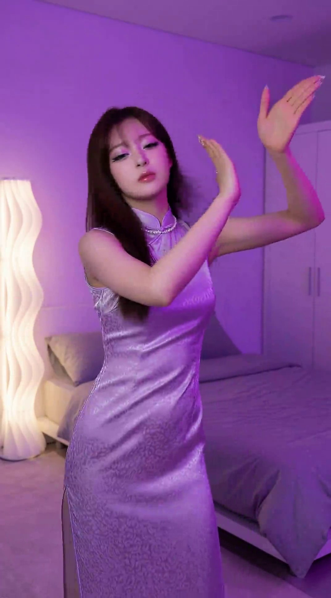 {"subject":{"description":"Use uploaded user image; lock face and hair color, do not lock hairstyle, makeup, or expression; character naturally integrated into the environment","pose":"Side profile, twisting slightly toward the camera with hands held together in a prayer or greeting gesture (Anjali Mudra)","facial_features":{"expression":"Playful and smiling","eyes":"Heavy glamorous makeup, smokey eyeshadow, and thick lashes","cheeks":"Prominent pink blush"},"hair":{"style":"Elegant updo with loose, wavy strands framing the face","color":"Dark brown","accessories":"Ornate silver floral hairpin with dangling elements"}},"clothing_and_accessories":{"outfit":"Sleeveless, form-fitting Cheongsam (Qipao)","fabric_pattern":"Dark base with an intricate, shimmering floral brocade pattern in tones of gold, mauve, and cream","jewelry":["Thin silver bracelet on the left wrist","Large decorative ring","Stud earrings"],"nails":"Long, almond-shaped manicured nails"},"environment":{"setting":"Modern minimalist indoor room","lighting":"Soft, moody ambient lighting with a strong pink and purple neon tint","background_elements":["Light pink walls","White wardrobe with vertical trim","Wavy, organic-shaped floor lamp","Dark doorway to the right","Polished tile floor with reflective sheen"]},"technical_details":{"aspect_ratio":"9:16 (vertical/portrait)","aesthetic":"TikTok aesthetic, soft focus, high-saturation, low-light photography","composition":"Medium shot, centered subject"}}