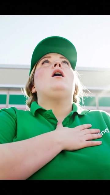 "subject": "Young, cute, slightly chubby Western woman wearing a green InsMind polo shirt and cap walking out of a glass storefront door",