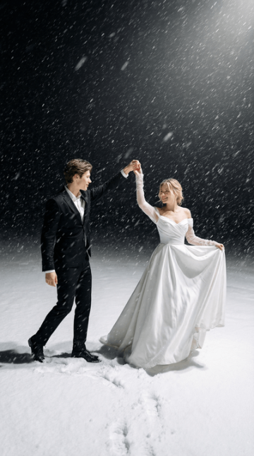{"scene_description":"A wide-angle cinematic shot of a young couple dancing in a heavy snowstorm at night. The woman is positioned on the left of the frame, the man on the right, on a thick, textured blanket of white snow.","subjects":{"woman":{"action":"Twirling gracefully, holding the hem of her dress with one hand and the man's hand with the other.","attire":"Elegant off-the-shoulder white wedding gown with a full, flowing silk skirt and long sheer sleeves.","appearance":"Use uploaded female character, lock face + hair color, do not lock hairstyle/makeup/expression, smiling joyfully."},"man":{"action":"Leading the dance, holding the woman's hand while stepping forward slightly.","attire":"Tailored classic black suit with a white dress shirt.","appearance":"Use uploaded male character, lock face + hair color, do not lock hairstyle/makeup/expression."}},"environment":{"ground":"Deep, powdery snow with visible footprints and soft undulations.","atmosphere":"A heavy blizzard with thick, elongated white snowflakes falling diagonally across the frame.","background":"A dark, void-like night sky that creates a sharp contrast with the brightly lit foreground."},"lighting_and_color":{"lighting_style":"High-key spotlighting from above, creating a glow on the subjects and the snow while leaving the background in deep shadow.","color_palette":"Monochromatic contrast of stark whites, deep blacks, and neutral grays.","mood":"Romantic, ethereal, and dramatic."},"technical_specs":{"aspect_ratio":"2:3 (vertical)","camera_angle":"Eye-level, medium-wide shot.","focal_details":"Soft focus on the falling snow to create a sense of motion blur, while the subjects remain the primary focal point."}}
