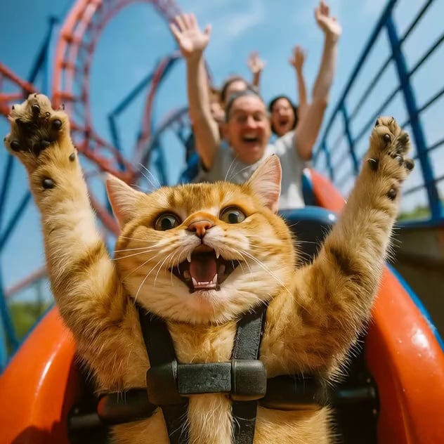 Fixed shot. The camera is fixed in front of the main subject. In the front row, the front paws are raised high, the mouth is wide open in a "roaring" posture, and the body slightly shakes due to the rapid descent of the roller coaster; passengers in the back row are holding their hands high, their faces showing exaggerated excited expressions due to the stimulation. The roller coaster track rapidly sweeps backward, and the overall picture is filled with a strong dynamic impact. The background is the metallic friction sound of the amusement park roller coaster track, the whistling sound of the air flow, mixed with the "screaming" and "roaring" of the main subject and the screams and cheers of the passengers, creating an immersive and thrilling amusement atmosphere.