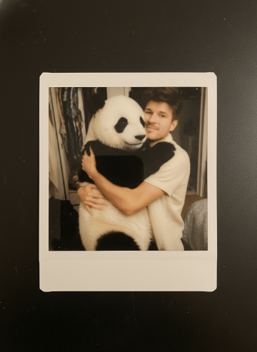 A portrait size image depicts the person attached in the uploaded reference image (Keep the face of the person 100% accurate from the reference image) sitting cross-legged on a grassy area, wearing a light khaki t-shirt, khaki shorts, black socks, and green sneakers with white laces. They are smiling gently while looking at the camera. Beside them sits a panda, with its black-and-white fur prominently displayed, including black ears, eye patches, and limbs, and a white face and torso. The panda appears calm, with one paw resting on the person's leg and the other on the ground, its claws slightly visible. The background features a lush, green outdoor setting with blurred trees and foliage, suggesting a natural or zoo-like environment. The overall mood of the image is serene and friendly.