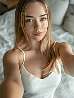 Her eyes are gently closed, her face calm and relaxed, capturing a moment of serene comfort and quiet elegance.