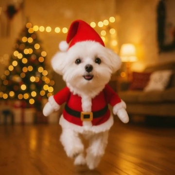 Place it on a festive Christmas stage with warm lights, decorations, and light snowfall.