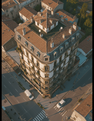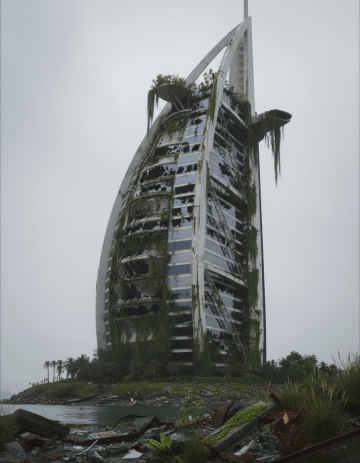 Using the reference image of the uploaded building, create a realistic version of the building abandoned for 100 years. The building is partially ruined, with broken windows, crumbling walls, collapsed roof, and overgrown with vines and vegetation. Surrounding ground covered in debris, moss, and grass. Moody, post-apocalyptic atmosphere, natural lighting, high-resolution, ultra-realistic details, preserving the original architectural features. Avoid distortion or complete disappearance of the building.