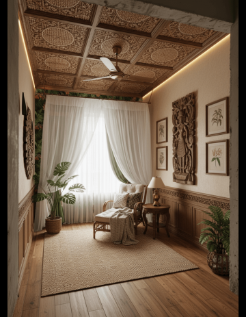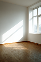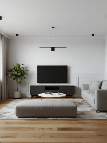 masterpiece, best quality, ultra-detailed, interior design visualization, the original room layout, Number of Windows remain completely unchanged, transformed into a refined living room: warm walnut engineered wood flooring, matte-white walls with subtle wainscoting, recessed ceiling spotlights and a minimalist pendant lamp, floor-to-ceiling sheer curtains in neutral beige, a low-profile L-shaped sofa in soft gray fabric facing a matte-black media console with 65-inch TV,