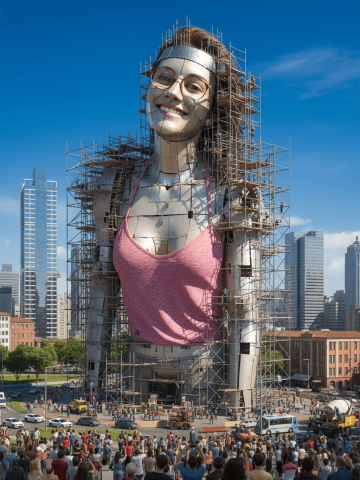 The main character in the uploaded picture has transformed into a huge art sculpture installation under construction in a modern city. The giant figure is surrounded by a large area of scaffolding, with a clear blue sky and a richly detailed urban landscape (including streets, buildings, vehicles, and the tiny crowd around the base) in the background. The overall picture is presented in super detail, combining the realistic texture and the aesthetic style of a surreal giant art piece.