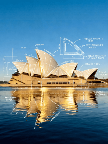 force vectors, structural notes, materials, load paths, geometry measurements.