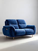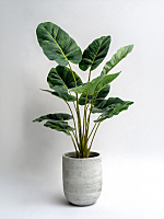 round marble coffee table centered on a muted geometric rug, two small brass side tables and potted fiddle-leaf fig.