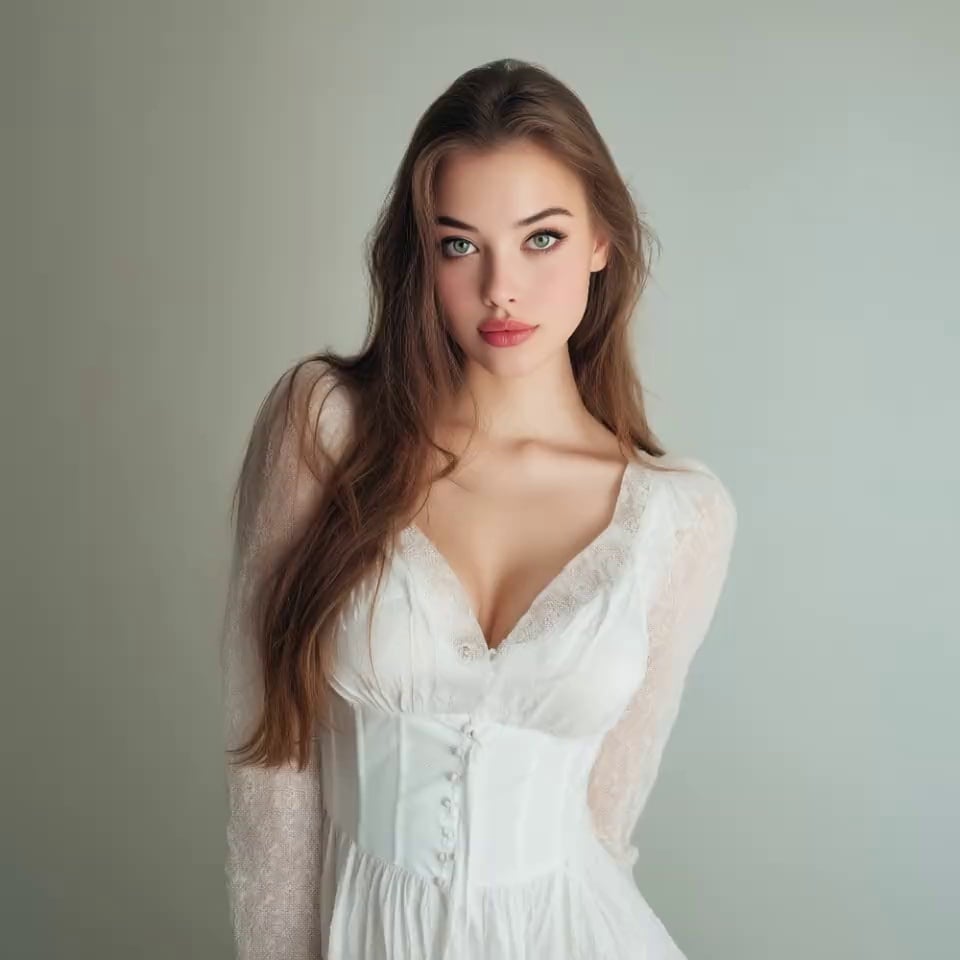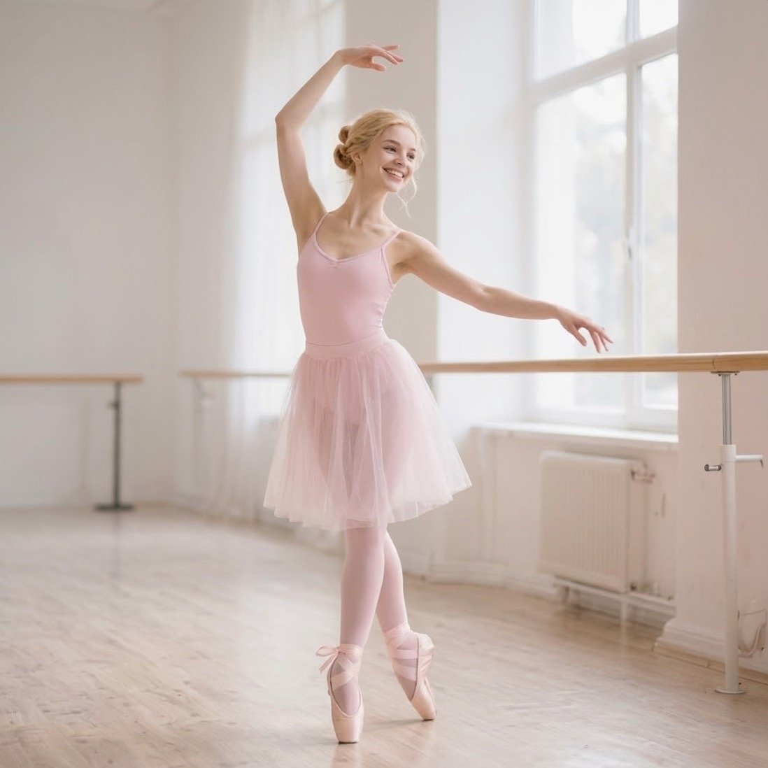 A girl in a white ballet dress was joyfully spinning in the center of the dance studio. Her arms were stretched out like a swan spreading its wings, and the tip of one foot lightly leaped up. The pink background wall reflected her elegant dance posture. A few feathers slowly drifted down as she moved, fixing the camera.
