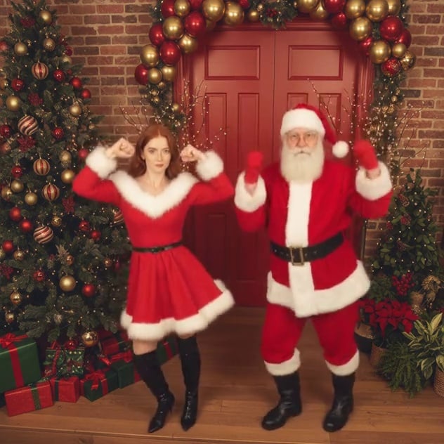 The two raised their arms, clenched their fists, and moved them back and forth near their chins. The right hand even reached above their heads and pulled downward, while the left hand did the same above their heads. Maintaining the consistency of the characters, the two rhythmically moved their bodies and danced. The music was playing a Christmas dance tune.